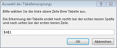 Wählen Sie die obere linke Zelle des Datenbereichs in Ihrem Excel-Arbeitsblatt aus (inkl. den Spaltennamen). In diesem Beispiel beginnt der Datenbereich mit dem Namen der ersten Spalte in A1.